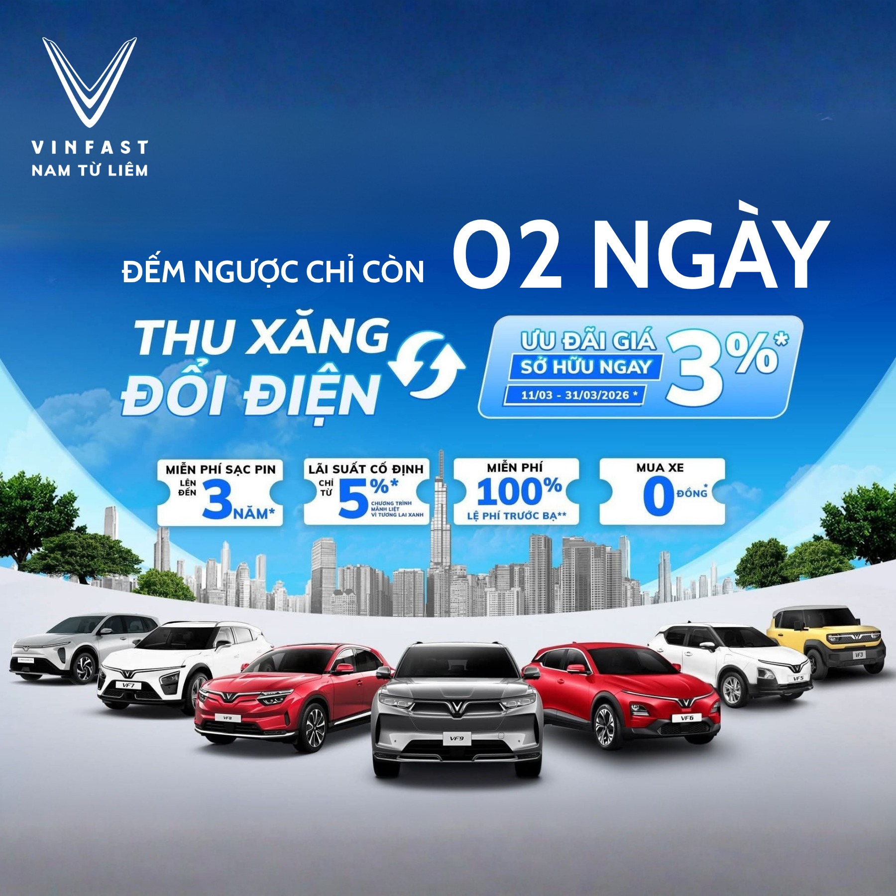 Kết luận: Chỉ còn 02 ngày cuối cùng! Đừng bỏ lỡ cơ hội sở hữu xe điện VinFast với ưu đãi Thu xăng – Đổi điện hấp dẫn nhất năm 2026. Liên hệ VinFast Nam Từ Liêm ngay hôm nay để được hỗ trợ tận tình và chốt xe với mức giá tốt nhất.