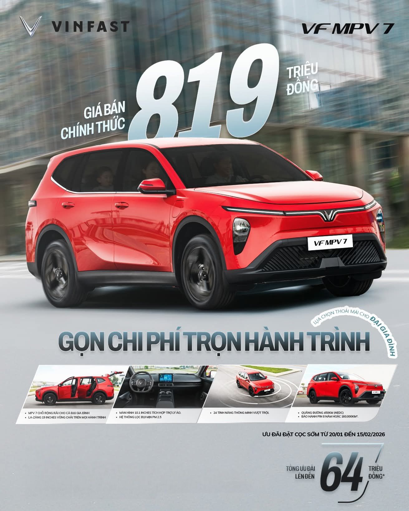 VinFast chính thức ra mắt VF MPV 7, mẫu MPV điện 7 chỗ hoàn toàn mới, được thiết kế dành riêng cho gia đình Việt hiện đại và khách hàng kinh doanh dịch vụ cao cấp. Với lợi thế chi phí sử dụng thấp – không gian rộng – công nghệ thông minh, VF MPV 7 nhanh chóng trở thành tâm điểm phân khúc MPV điện tại Việt Nam.