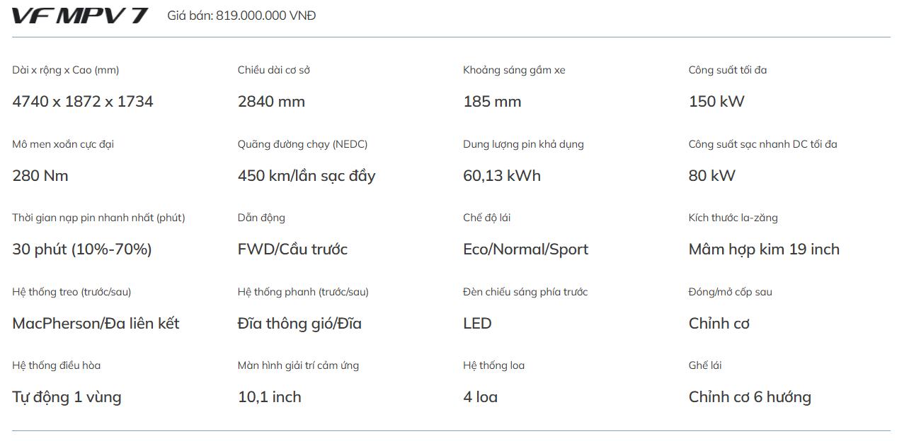 Thông Số Kỹ Thuật VinFast VF MPV 7 (Mới Nhất)